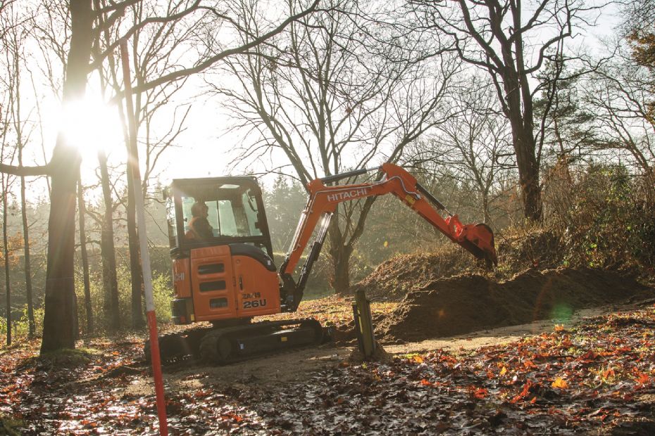 Hitachi heeft een breed arsenaal van vijftien minigraafmachines met uiteenlopend motorvermogen en bedrijfsgewicht. Meker Tuinen heeft er tien in gebruik, variërend van de kleinste ZX10U-6 tot de middelzware ZX38U-6. 'Het is een mooie range van smal naar breed. Ze zijn niet alleen gekozen op grond van het gewicht, maar ook vanwege de omvang. Je moet vaak een tuin in door een smalle doorgang. De kleine ZX10U-6 is hiervoor ideaal, omdat de breedte instelbaar is. Ook is deze minigraver heel geschikt voor het planten van bomen. De grotere modellen zetten we bijvoorbeeld in voor het planten van grotere bomen en graafwerkzaamheden voor onder meer zwembaden. Zo kunnen we uiteenlopende projecten effectief aanpakken.'