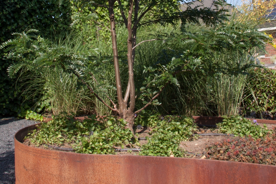 'Drie jaar geleden hebben we dit staal voor het eerst zo in vorm gebracht voor een particuliere tuin in Sambeek in het Land van Cuijk', vertelt Leon van Duijnhoven. Hij is samen met Bernie Verheijen eigenaar van Deco Tuinen, een hoveniersbedrijf in Rijkevoort, dat in dezelfde Noord-Brabantse gemeente ligt. 'Om de organische vormen te krijgen, hebben we de platen gewalst, iets rond getrokken en daarna ter plekke aan elkaar gelast met ijzeren strips als versteviging. Dit geheel bleef goed zitten. Sinds die tijd hebben we dit voor meerdere tuinen gedaan waarin deze organische vormen mooi uitkomen. Zo hebben we ook een plantenbak gemaakt met ronde vormen. De eerste tuin waarvoor we die ronde vormen gebruikten, was van een particulier in Sambeek. Het ging om een voortuin van 40 à 50 vierkante meter, die op de foto's bij dit artikel te zien is.'
