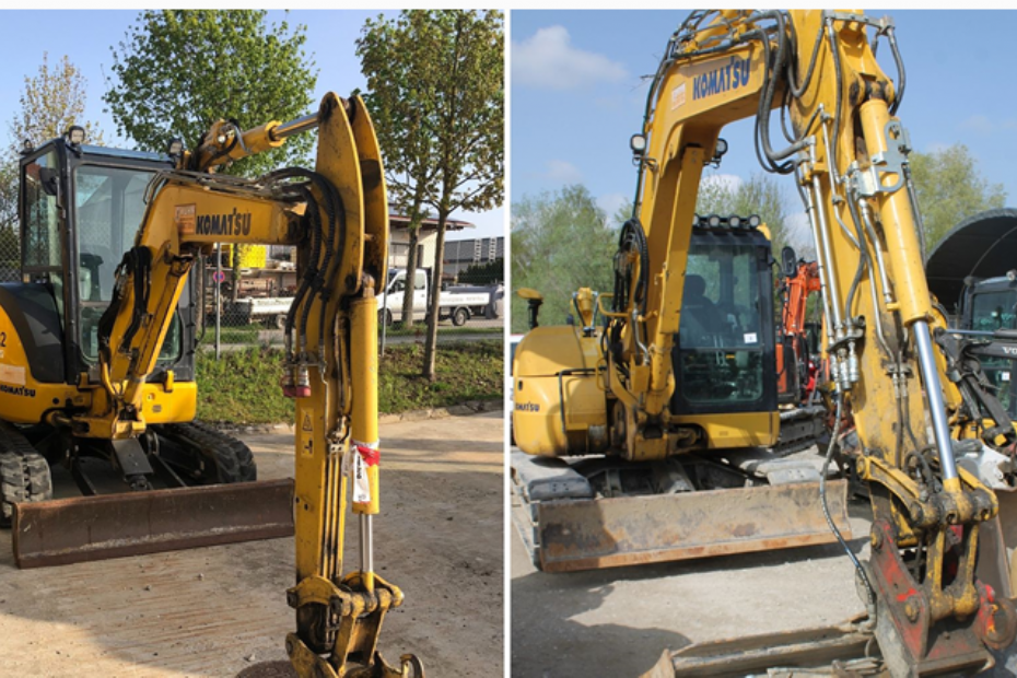 | | Komatsu minigraafmachine: de PC88MR-10 (rechts) en de PC35MR-5 (links), beide uit bouwjaar 2019, zijn tot 21-05 beschikbaar voor veiling. (© HT). |