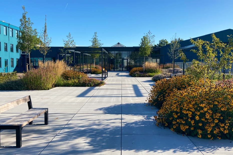 'Speels verdeeld over de hele oppervlakte hebben we vijf open "hubs" geplaatst: plekken voor ontmoeting en overleg. Ook staan hier en daar duurzame zitbanken.' Ook het paarsblauwe kattenkruid is goed vertegenwoordigd: een knipoog naar het blauwe bedrijfslogo van de opdrachtgever. Om tuinonderhoud te beperken, werden bodembedekkers aangeplant. 'Elk bloeiseizoen bloeit er wel iets, een prachtig gezicht', zegt Kramer. 'Op den duur zullen de jonge bomen - elzen, sierperen en krentenbomen - voor schaduw zorgen.'