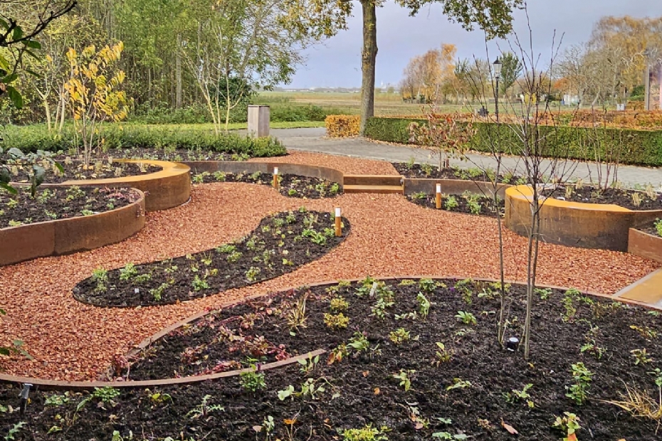 | | Voor de ronde vormen zijn cortenstalen keerwanden van Adezz gebruikt. |