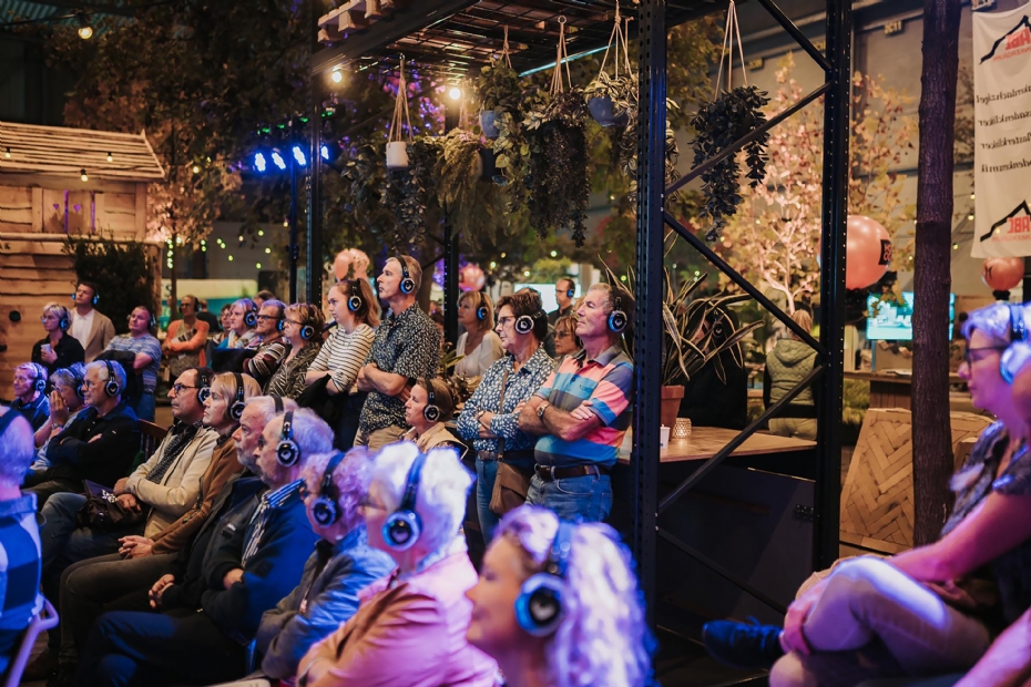 | | Met het 'silent disco'-concept konden bezoekers tijdens kennissessies met koptelefoons naar sprekers luisteren (Foto: FYX Agency) |