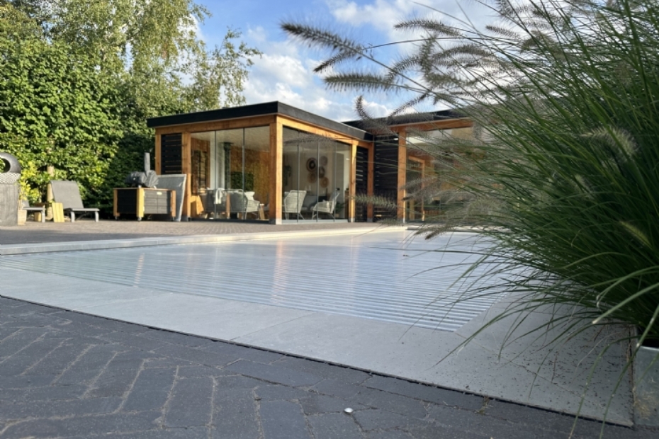 De strak vormgegeven trap is een krachtig element om een deel van het hoogteverschil op te vangen. De treden zijn bekleed met keramiek wat overeenkomt met de zwembadrand en de terrastegels. Het zwembad is afgewerkt met een randtegel met een neus, hierdoor krijgt het zwembad strakke en moderne uitstraling. Aan het zwembad is een luxe buitenverblijf neergezet waar men kan ontsnappen aan de drukte van alledag en genieten van de rust en comfort.