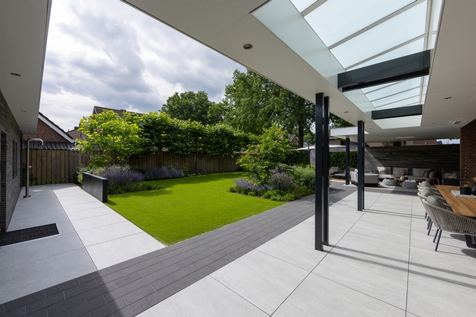 Of je nu aan het eten bent, gezellig wilt borrelen of even van de zon wilt genieten, aan elke activiteit is gedacht in deze Du Bois-tuin. En nog belangrijker, op elke plek kun je genieten van alles wat de tuin en de natuur te bieden hebben. De indeling, de mix van materialen en de overgangen tussen de verschillende zones creëren een gevoel van vrijheid en ruimte. De combinatie van drie verschillende tegels van MBI Steenmeesters laat de gebruikers duidelijk de verschillende gebruiksmogelijkheden zien: eten, samen zijn, de zon aanbidden ... Het looppad, gevormd door contrasterende klinkers, slingert door de tuin en verbindt de verschillende terrassen met elkaar. Het pad nodigt uit om elk hoekje van de tuin te verkennen en de rust in je op te nemen terwijl je door de combinatie van gras en bloemen slingert.