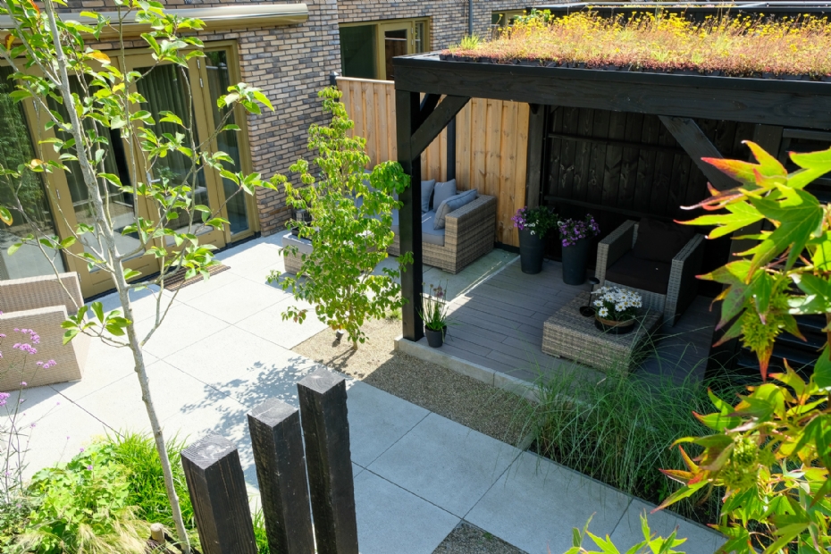 De keuze voor de juiste materialen was cruciaal voor het succes van het project. De levering van het materiaal door Buiter Beton speelde daarin een belangrijke rol. 'Doordat we alles wat we nodig hadden, bij Buiter Beton konden bestellen, maakte dit de samenwerking heel efficiënt.' In een groot deel van de tuinen zijn materialen verwerkt van Terras & Trends Deck, een composiet vlonderplank van Buiter Beton. In een van de tuinen is de Vintage Lunar Grey toegepast onder een zwarte overkapping Palermo. De overige verharding is uitgevoerd met oud-Hollandse tegels.