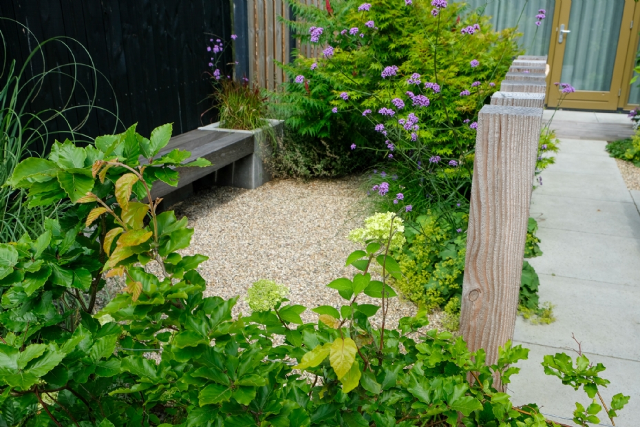 De stijlen variëren van strak en modern tot organisch en speels. 'In de ene tuin hebben we organische vormen toegepast, terwijl een andere juist strakke lijnen heeft. De materialen zijn afkomstig van Buiter Beton, variërend van designtegels tot halfverharding, zoals split en hout. We hebben bijvoorbeeld palen van douglas geplaatst om kliko's weg te werken, terrassen met hardhouten dekdelen toegepast en een pergola geïnstalleerd met schaduwdoek dat je open en dicht kunt schuiven. De kunst is om alle mogelijkheden in een relatief kleine ruimte te benutten, zonder dat het te druk wordt.'