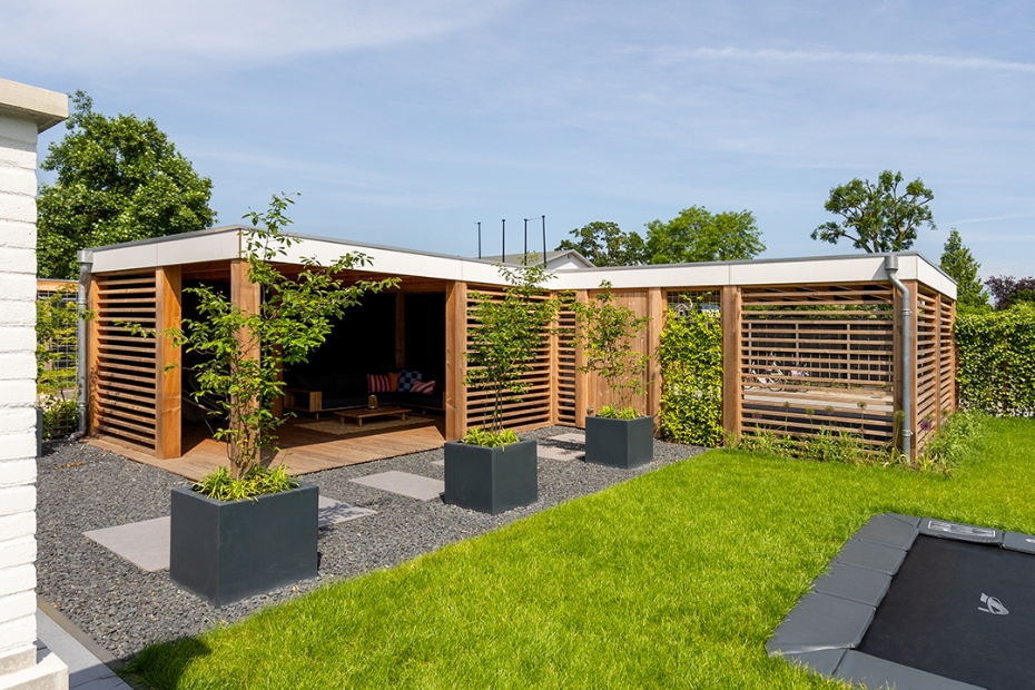 De tuin die Janneau van Gils, eigenaar van JvG Bestratingen en Tuinaanleg, mag aanleggen hoort bij een nieuwbouwhuis in Waddinxveen. De klant wilde een carport van 6,5 meter breed, met een overspanning zonder middenstaanders. Met alleen houten balken zou deze niet stabiel genoeg zijn. 'Er moest hiervoor dus een veilige en tegelijkertijd mooie oplossing worden gevonden,' aldus de hovenier uit Waddinxveen.