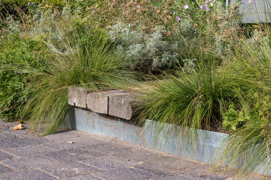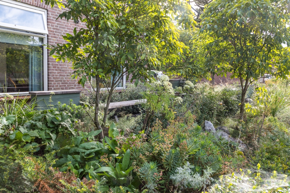 'In het ontwerp hield ik niet alleen rekening met het milieu, maar ook met het veranderende klimaat. Vrijwel alle materialen zijn hergebruikt en een derde van de beplanting is inheems. Bomen zoals de kastanje zorgen op warme zomerdagen voor verkoeling in de tuin én in de woning. Het ontwerp bestaat uit heldere strakke lijnen die doorlopen in de hagen, muurtjes en de bestrating van de oprit. De weelderige beplanting verzacht de harde lijnen.' Poppelaars gebruikte veel vaste planten en siergrassen. 'Uit milieuoogpunt heb ik bewust zoveel mogelijk inheemse planten gebruikt. Denk aan duizendblad, grote graslelie, veldsalie, wildemanskruid en muskuskaasjeskruid. Ik heb ook gekeken naar planten die CO2 opnemen. Het onderhoud is minimaal, omdat de bodem vrijwel gesloten is en onkruid weinig kans krijgt.' De hergebruikte materialen bestaan onder andere uit koperslakkeien. 'Deze heb ik verwerkt in de oprit. Voor het verhoogde vlonderpad naar het zitgedeelte zijn hardhouten balken gebruikt die afkomstig zijn uit een bruinkoolmijn in Zuid-Limburg. Het beschutte zitgedeelte bestaat uit olivijnsplit, dat de eigenschap heeft CO2 aan zich te kunnen binden.'