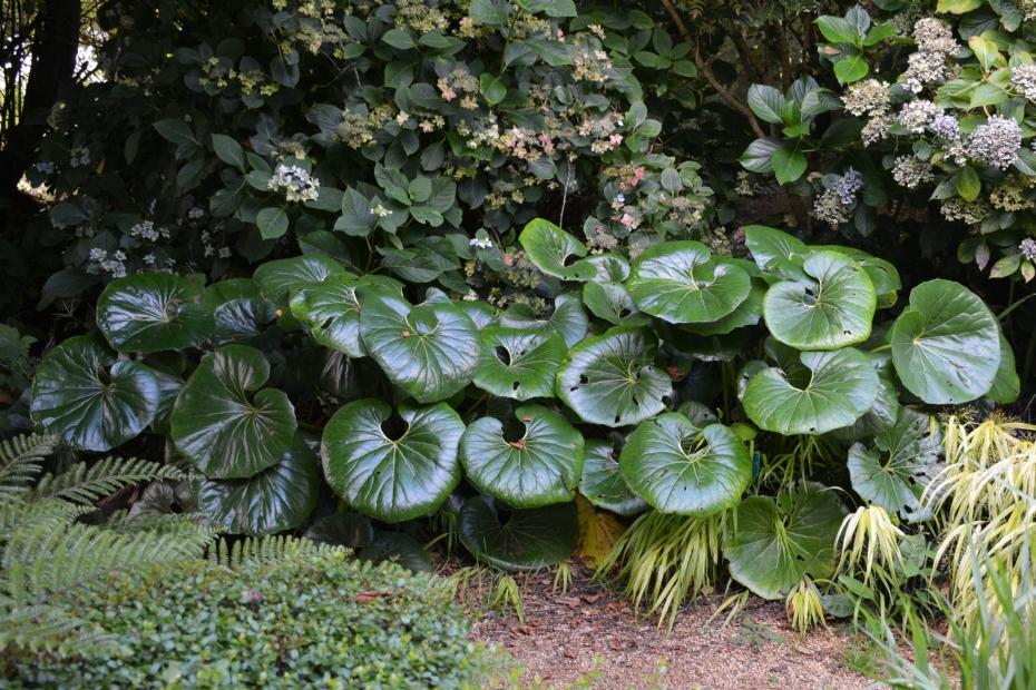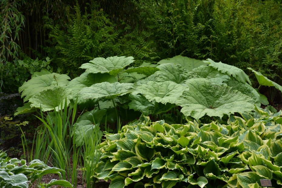 In veel tuinen wordt als opvallende bladplant Gunnera manicata gebruikt, of de in Engeland invasief verklaarde Gunnera tinctoria. Die heeft mooi, indrukwekkend, stoer en onovertroffen groot blad, maar waarom niet eens iets anders verzinnen? En dan staat hij vaak ook nog in zijn eentje groot te zijn aan de waterkant, terwijl één van de belangrijkste regels bij het maken van een beplantingsplan is: alle (opvallende) planten in drieën toepassen. Om in balans te komen, zouden er dus nog twee andere grootbladigen in een ongelijkbenige driehoek in het beplantingsplan geplaatst moeten worden. Anders lijkt het of de tuin overhelt naar de kant waar de Gunnera staat.