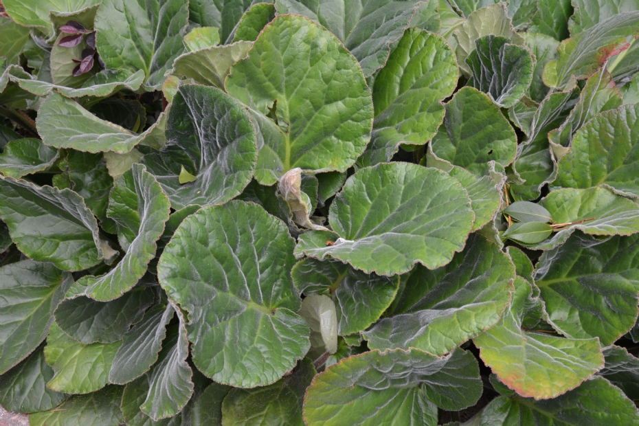 Bergenia cordata is bekend en kan flinke bladeren krijgen, maar deze wintergroene soort van de schoenlappersplant kom ik ook steeds vaker tegen in tuinen. Een leuk extraatje is het zacht behaarde blad. Hij is iets gevoeliger voor vorst. Mocht dat gebeuren, dan sterft het blad af en komt het in het voorjaar weer terug. De zachtroze bloemen die er volgens de boeken in moeten komen, heb ik nog nooit gezien, maar is dat erg? Het blad is op zich al een sieraad voor de tuin. Hoe rijker de grond, hoe groter het blad. Zet hem minstens in halfschaduw.