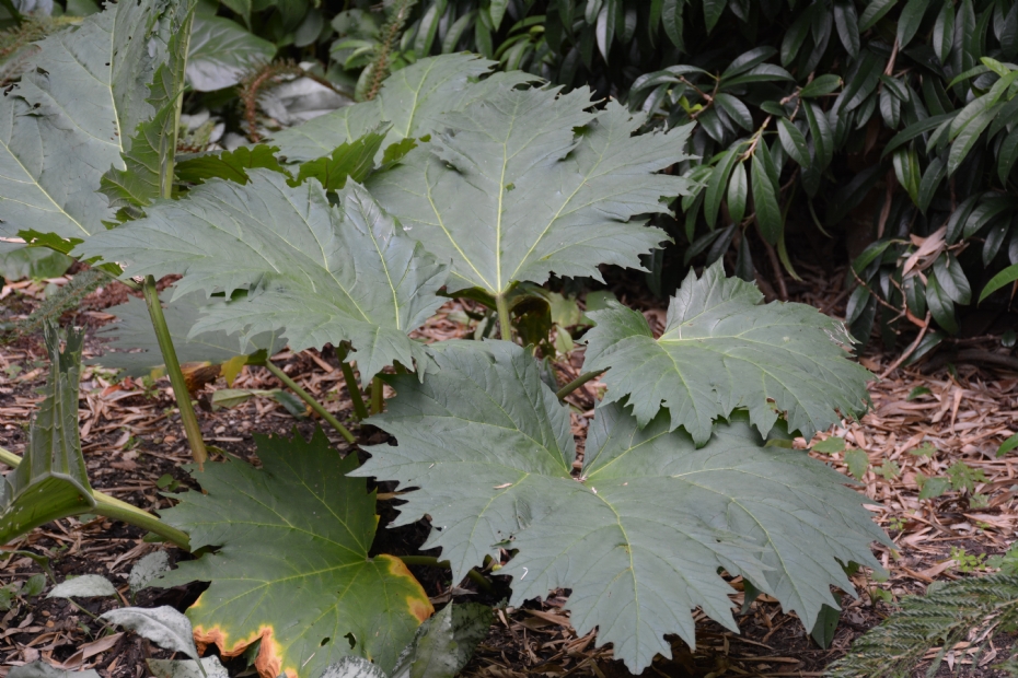 In veel tuinen wordt als opvallende bladplant Gunnera manicata gebruikt, of de in Engeland invasief verklaarde Gunnera tinctoria