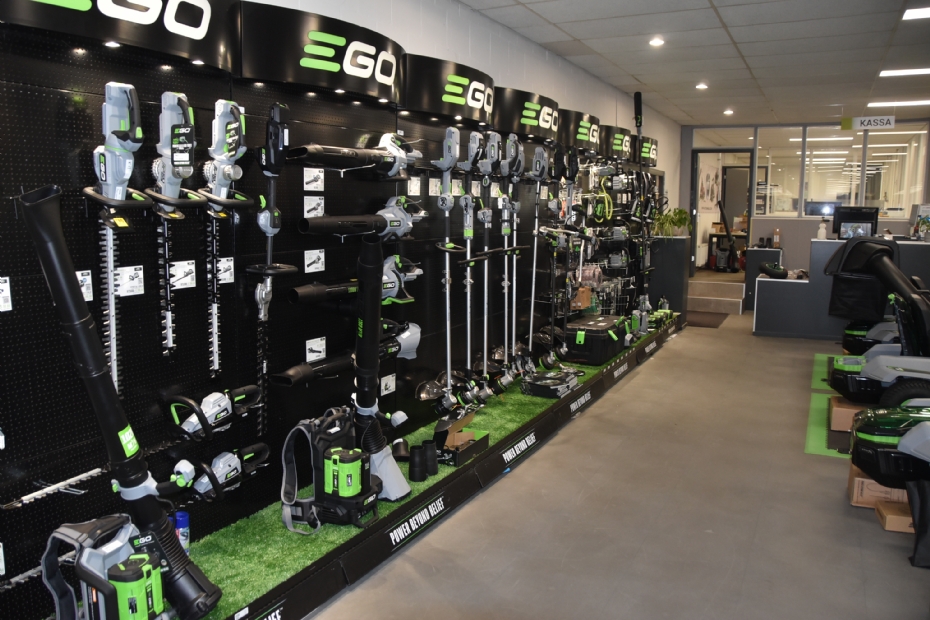 En dat is niet het enige. Vele tuin- en parkmachines van merken als Tielburger, AS-Motor, DiBo, Limpar, SABO, ELIET, NIMOS en REMARC hebben machines die zijn uitgerust met een EGO-motor en werken daarmee ook met de uniform uitwisselbare 56V-accu's van dit merk. Schepers: 'We zijn dan ook dealer van een aantal van deze merken. Ik ben hier twee jaar geleden in de verkoop gaan werken. Wat me allereerst opviel, was dat er toen al bij Bruggeman een beperkt aantal machines met een verbrandingsmotor in de showroom stond. En ik benadruk: dit komt door die merken die op dat EGO-accuplatform werken. Machines met de traditionele motoren leveren we uiteraard wel. Als je een EGO-kettingzaag hebt, passen dezelfde accu's in de bladblazers van dit merk. Als een professional, een bedrijf of een enkele particulier zo'n EGO-zero-turnzitmaaier aanschaft, zie je al snel dat handgereedschap van dit merk snel volgt.'