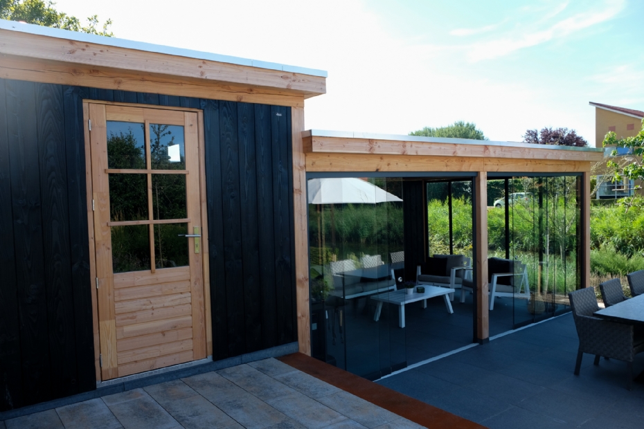 Er zijn een tuinhuis en een luxe buitenverblijf gerealiseerd, volledig op maat ontworpen om de hoogteverschillen op te vangen