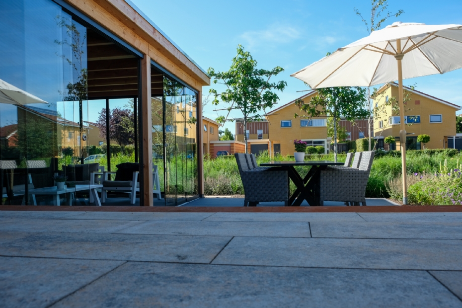 Naast het tuinhuis en buitenverblijf is er ook veel aandacht besteed aan de bestrating. De genuanceerde tegels in geel, zwart en bruin van Smartton Sierra Madre vormen een perfecte match met de woning en de cortenstalen randen. 'In deze tuin is gebruikgemaakt van diverse materialen', vertelt Bertwin Mooijers, hoofd verkoop van Buiter Beton. 'De Smartton-tegels zijn misschien een gewaagde keuze, maar ze passen uitstekend in het geheel.' Naast de opvallende Smartton-tegels spelen de keramische Ampasto Olivian-tegels van terras & trends op het terras een belangrijke rol. 'Deze springen er echt uit', vervolgt Mooijers. 'Samen met de oud-Hollandse tegels voor de trap en de houten vlonder aan het water zorgen al deze verschillende materialen toch voor een rustig en harmonieus totaalplaatje.' De in-lite-verlichting in de tuin en met name bij de trap zorgt in de avond voor een mooie sfeer.