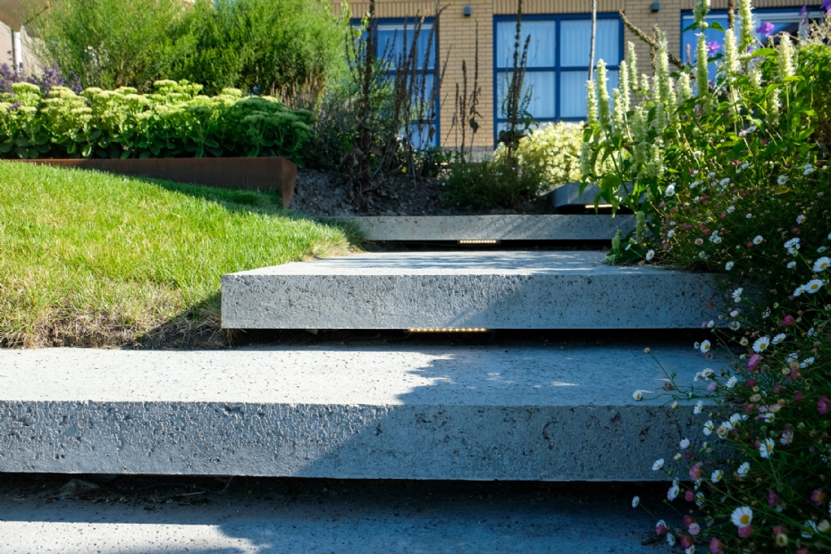 Een belangrijk element in het ontwerp was de regenwaterafvoer, om de steeds extremere regenbuien het hoofd te kunnen bieden. Madhuizen: 'We hebben een draingoot van terras & trends geplaatst langs de cortenstalen randen bij het huis, waardoor het water netjes kan worden afgevoerd naar een daartoe aangelegde drainage. Het voorkomen van wateroverlast is natuurlijk essentieel. In onze ontwerpen houden we daar altijd rekening mee.'