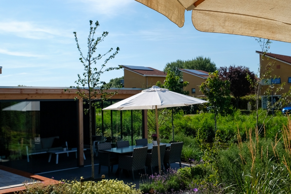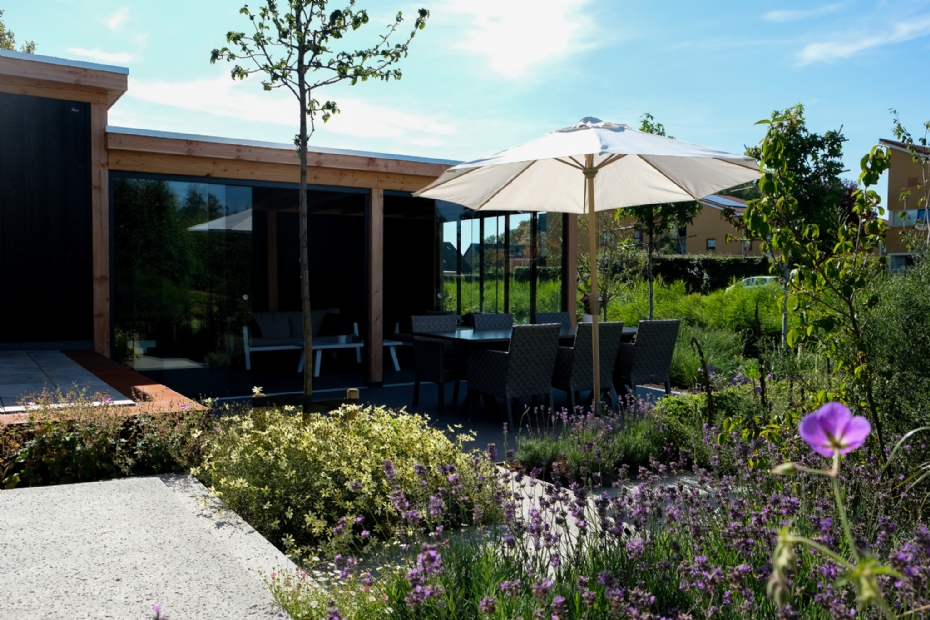 Met de beplanting zijn mooie natuurlijke hoekjes gecreëerd. 'Door de strategisch geplaatste beplanting zit je aangenaam verstopt in de tuin. Zo ontstaat er een rustige, geborgen sfeer.' Ook voor kinderen biedt de tuin genoeg mogelijkheden. Zo is het tuinhuis een ideale relaxruimte. Op mooie zomeravonden kunnen de bewoners op de vlonder zitten bij een vuurkorf.