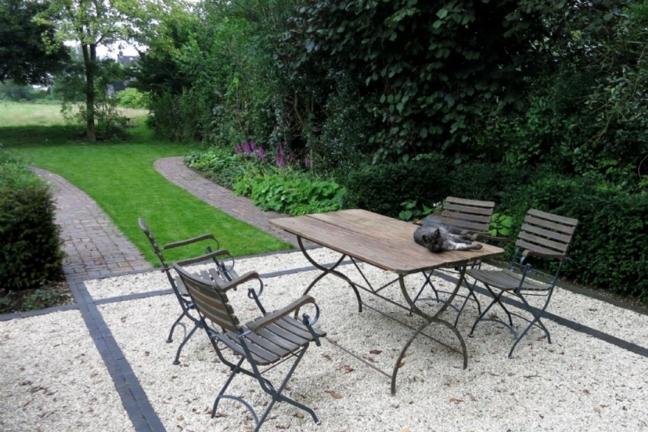 In samenspraak is er door Jeroen Redel Tuin- en Landschapsontwerp gekozen voor een tuin die past bij de oude Britse stijl. Dat betekent met eenvoudige vormen, veel symmetrie, lange lijnen, een klassiek afgebakend gazon en met beplanting waarbij weelderige cottage-planten contrasteren met formele blokhaagjes van taxus. Vanuit het huis gezien openen nu twee paden van oude tienduimers (gebakken keiformaat) de blik op het achter de tuin gelegen weiland. Het linker pad leidt naar een schuurdeur, het rechter loopt dood tegen de windsingel die gedeeld wordt met de buurtuin.