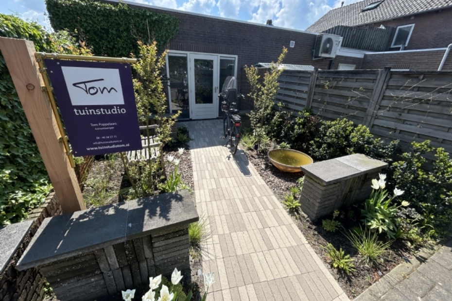 De entree van de ontwerpstudio Tuinstudio Tom is recent vernieuwd. Waar voorheen sprake was van volledige verharding, is nu een groene inrichting gerealiseerd. De stoeptegels zijn volledig hergebruikt: deels als materiaal voor stapelmuurtjes, deels afgestaan aan een buurtbewoner voor toepassing in een bouwproject.