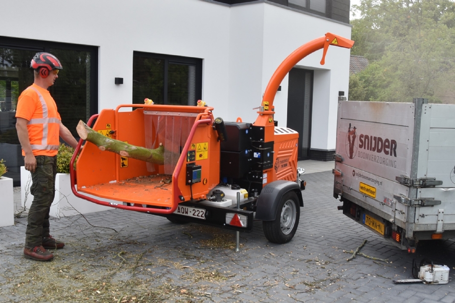 'Zodra ze een tak ter dikte van een bovendij in de machine staken, leek het net alsof de versnipperaar telkens even hikte, om dat harde, droge beukenhout naar binnen te werken. Dit proces wordt automatisch aangestuurd door de boven- en onderrol, wat ervoor zorgt dat het geheel niet vast kan lopen. Het verwerken van het hout vormde geen enkel probleem. Ik adviseer hierbij overigens om het dunste van een dikke tak of stam als eerste in de houtversnipperaar te stoppen. Dunner hout met zijtakken voert de machine echter met gemak zelfstandig in. Inmiddels heb ik al vele demonstraties uitgevoerd met deze machine, die we deze herfst ook meenemen naar de Hoveniersdag.'