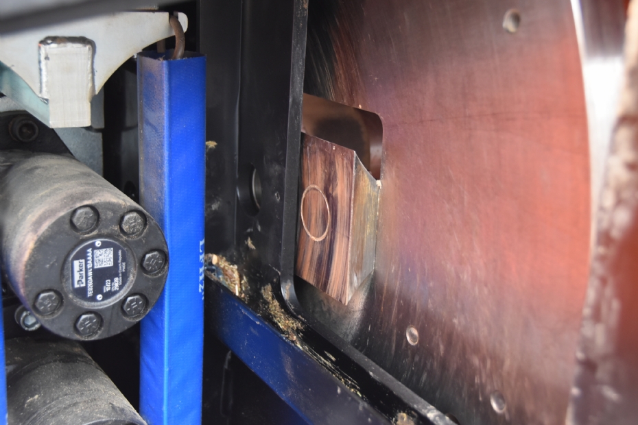 Wat mij verder opvalt is de relatief dunne uitblaaspijp met reflector. Merckx geeft hiervoor als verklaring: 'Op de versnipperschijf is niet één mes over de totale lengte gemonteerd, maar bevinden zich twee kortere messen, met elk een opening. Hierdoor verloopt het knippen op het vaste mes veel soepeler. Een mes knipt het ingevoerde hout eerst aan de ene zijde van de stam op het vaste mes en een fractie later, een halve omwenteling later dus, met het tweede mes aan de andere zijde. De impact op de versnippersschijf vermindert hierdoor en de houtchips zijn met 19 millimeter kleiner dan conventioneel. Dankzij die kleinere houtdelen volstaat een smallere buis, terwijl door het venturi-effect de luchtstroomsnelheid in de uitblaaspijp toeneemt.'