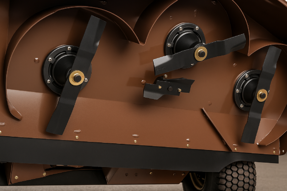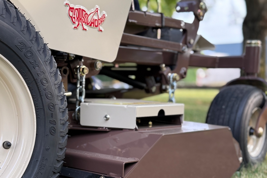 | | Uniek aan de Grashopper-zeroturnmaaiers met achterlozing is het vierde mes, dat ervoor zorgt dat het gras over de gehele breedte van het maaidek verspreid wordt. |