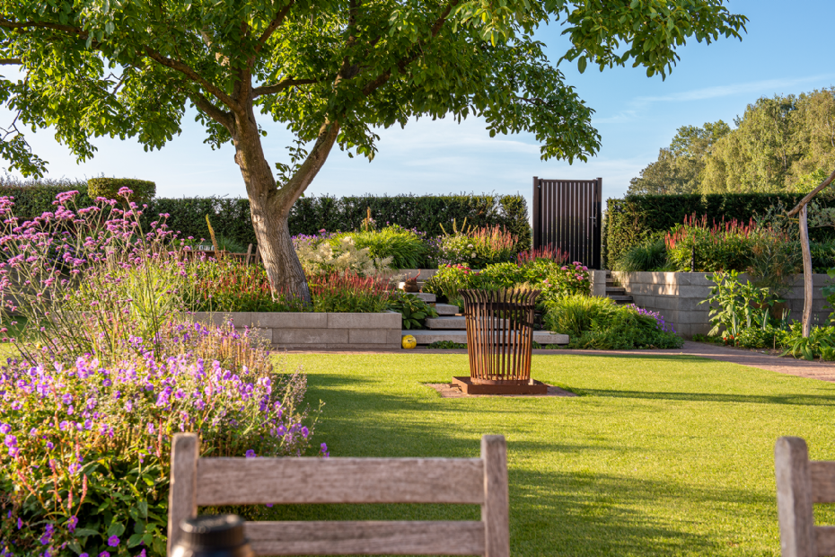 Job Wolters van Beau Verde ging er met de tweede prijs vandoor. In de door hem ontworpen tuin in het Limburgse Posterholt vormde een imposante notenboom het uitgangspunt van het ontwerp. De combinatie van weelderige beplanting met luxe materialen, zoals de zwevende trap van grootformaat Schellevis-tegels viel de jury in positieve zin op. 'Door de vele erfgrenzen was het een uitdaging om samenhang te creëren. We hebben dat opgelost door rust te brengen met duidelijke zichtlijnen en looppaden. In die zin is het best een strakke tuin geworden. Het is dan mooi om daarin het weelderige van de beplanting op te zoeken en met kleur, geur en smaak te werken', laat Wolters weten.