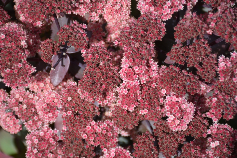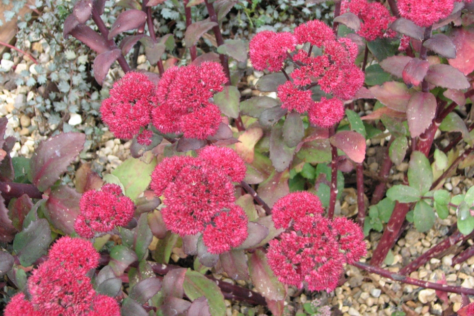 Een echt afwijkende bloemkleur heeft 'Red Cauli'. Met wat verbeelding zie je dat hij inderdaad rodekoolkleurig blad heeft. En in plaats van roze in allerlei tinten zijn de bloemschermen juist warmrood; 'robijnrood' wordt wel gebruikt om de kleur te omschrijven. Ook de stelen zijn donkerrood. Deze plant is eveneens bekroond met een AGM. De plant is ranker van opbouw dan de 'Herbstfreude'-types. Ook uitgebloeid blijven de bloemschermen tot aan de eerste vorst intact. Hij is leuk om in een hot border te gebruiken.