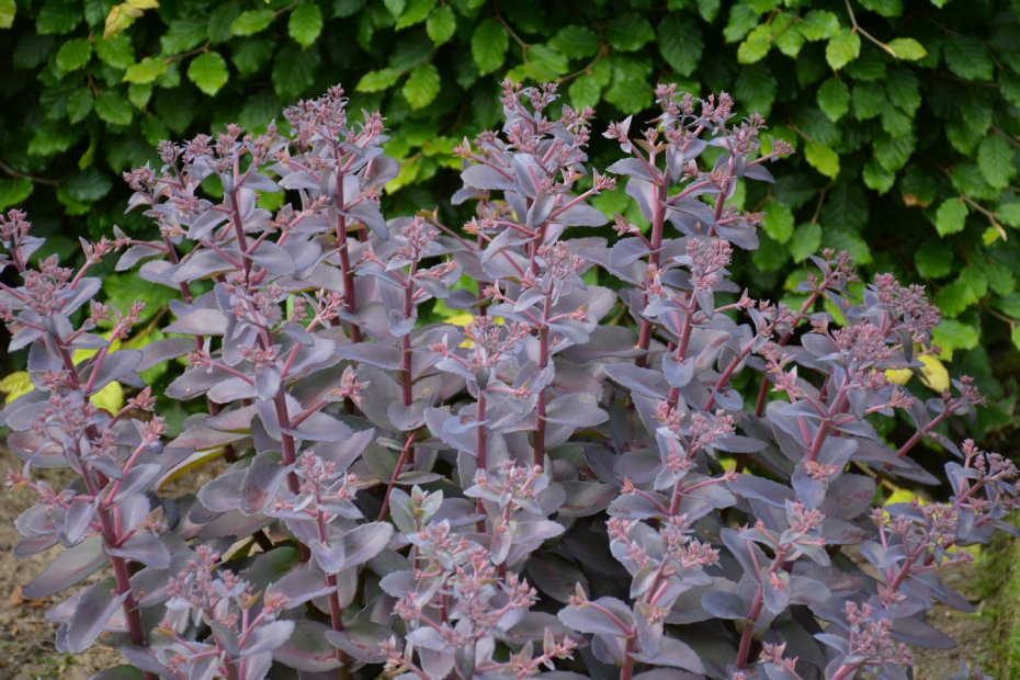 Eén van de opmerkelijke verschillen met andere hoge Sedum-soorten is dat 'Purple Emperor' vroeger bloeit dan de rest. Vanaf juli start de bloei met schermen met een doorsnede van rond de 10 cm. Op de foto zie je dat de plant iets in de schaduw staat; dan komt er meer groen 'door het blad heen'. Deze cultivar was één van de eerste met donkerkleurig blad. Hij werd eind vorige eeuw al geïntroduceerd, maar het is nog steeds een stevige plant zonder ziektes of zeertes. De bloemkleur is zalmroze - ook niet alledaags.