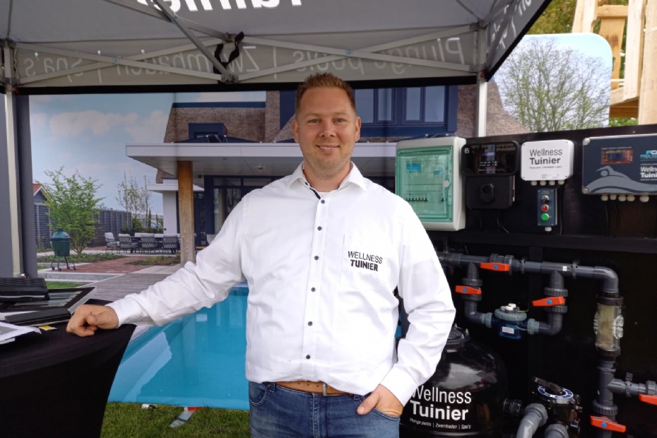 Wellness Tuinier, Dirk-Jan: 'We zijn er voor de hovenier en we plaatsen nu voor ons zesde jaar zwembaden door heel Nederland i.s.m. de hovenier. Het werkt twee kanten uit: of we zoeken voor een klant een hovenier die mee kan werken, of een hovenier zoekt ons als partij op. Wij hebben een zwembaden in twee dagen helemaal klaar, alle aansluitingen passen op een pallet, zoals je ziet. Het is plug and play.'