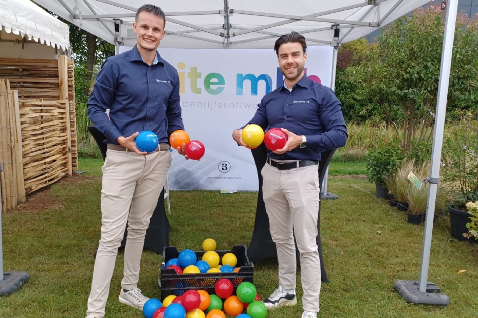 Maarten van Eeden en Jesse Roozeboom van Become-IT delen gekleurde ballen uit om aandacht te vragen voor hun bedrijfssoftwarepakket. Hoveniers kunnen hiermee hun administratie bijhouden, van offerte tot facturatie.