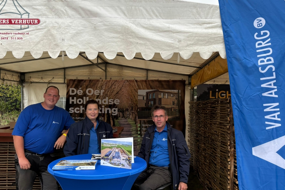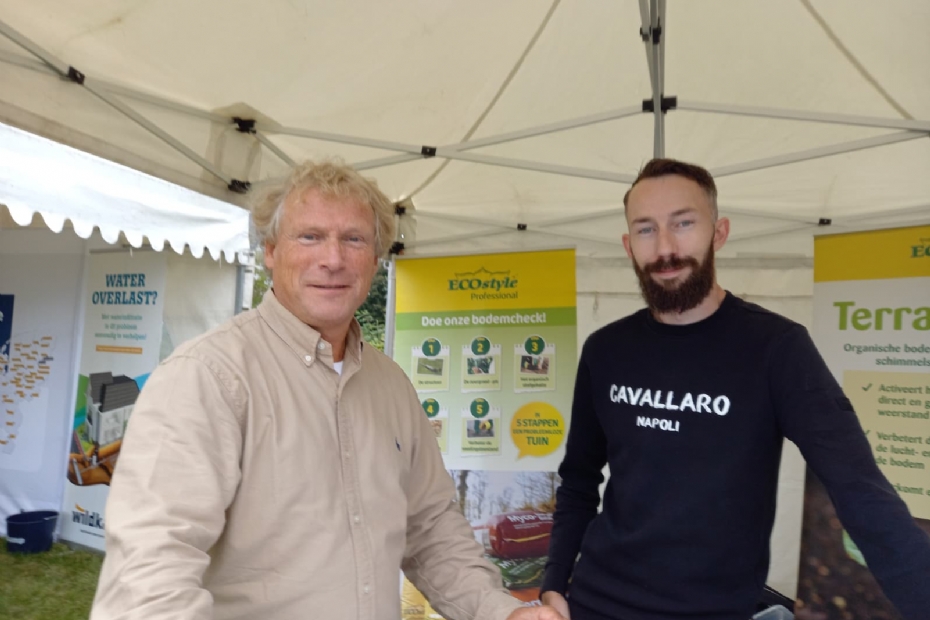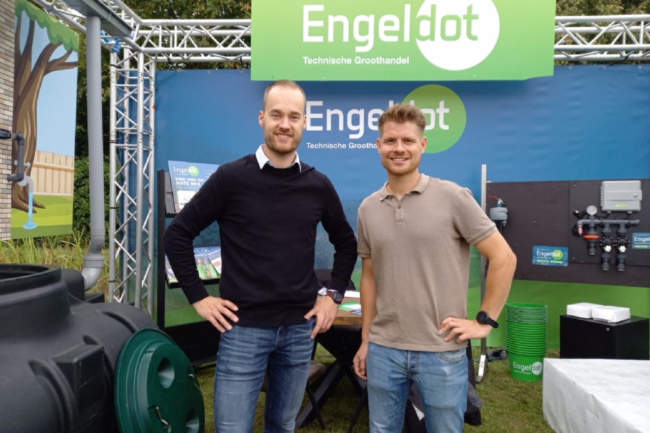 Martijn Wellink en Koen ten Napel van Engeldot: 'Erg leuk om veel bezoekers van Hardenberg op een ander moment in het seizoen hier weer te zien. We zijn bewust in het natste hoekje van het terrein gezet, maar daar hebben we een oplossing voor: we zijn gespecialiseerd in watermanagement, zowel afvoer als opslag. We willen de hovenier hierin meenemen, want nog niet iedereen is hier even bekend mee. Desgewenst gaan we met de hoveniers mee op locatie en voorzien we hen van advies. We laten de nieuwste ontwikkelingen daarbij zien. Nu hebben we een grote watertank staan. Normaal gesproken gaat die de grond in.
