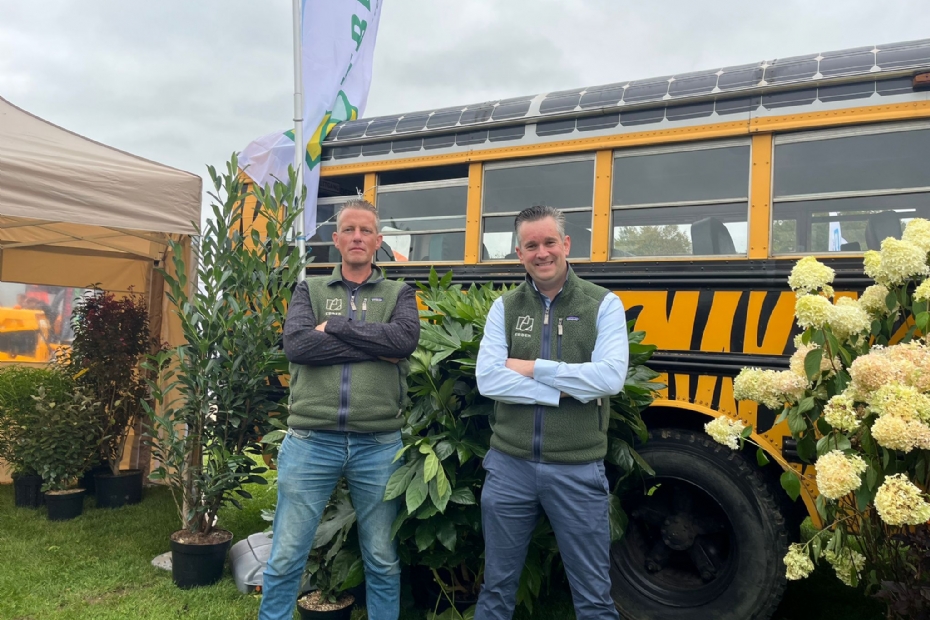 Martijn Vogelaar en Johan Zaaijer van Boomkwekerij Ebben hebben ook hun schoolbus mee naar de Nationale Hoveniersdag. In de schoolbus zijn de hele dag leuke lezingen te volgen over AI, personeelsbeleid rondom verzuim en de strengere controle van de Arbeidsinspectie op dieselemissies. Bij Ebben verder volop informatie over sortimentskeuze.