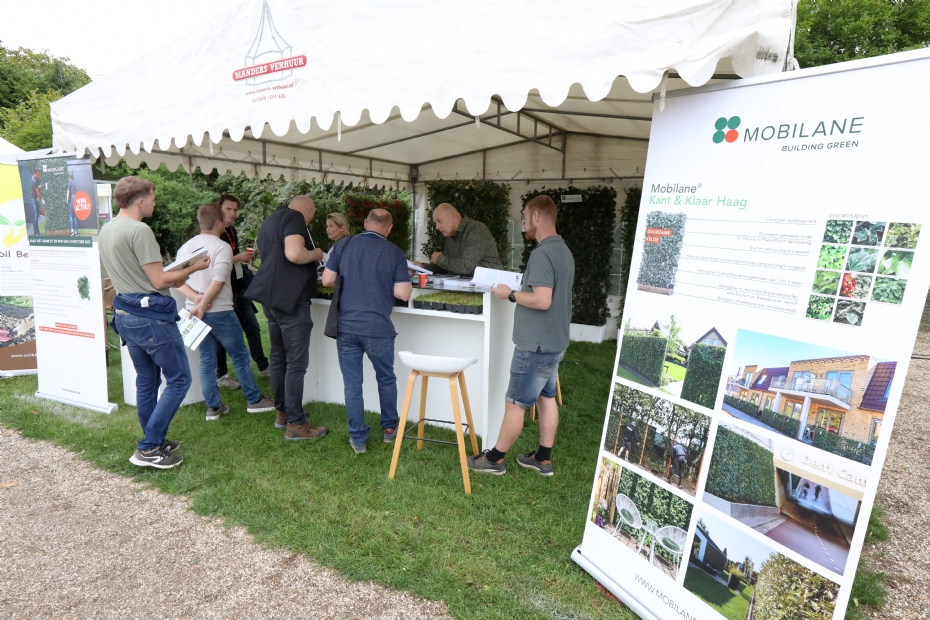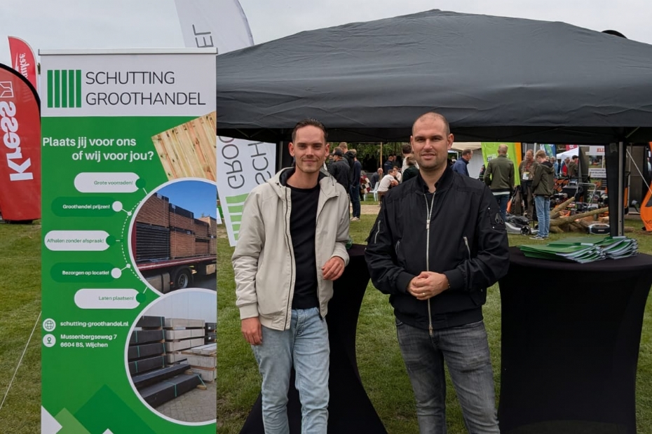 Het team van Schutting Groothandel (Mike van den Biggelaar en Koen Willems) geeft aan een aantal interessante gesprekken te hebben gevoerd deze dag. 'We wilden wel eens kijken of deelname aan de Nationale Hoveniersdag wat zou opleveren. Het valt qua bezoekers absoluut niet tegen. Waarin we ons onderscheiden, is dat we verder gaan dan het leveren van schuttingen. We kunnen deze ook installeren en laten bezorgen. Momenteel kijken we of we partners kunnen vinden die onze schuttingen kunnen installeren. Totaalontzorging bieden is ons doel,' stelt Mike van den Biggelaar.