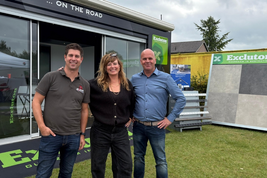 Duurzame bestrating is wat Excluton presenteert op dit event. 'Onze nieuwe innovatie is een nieuwe klimaatadaptieve bestratingslijn. We hebben veel aanloop gehad deze dag', zegt Tynke van den Heuvel. 'Het is belangrijk om in gesprek te gaan met je klanten en bezoekers en dat kan hier', zegt De Jager.