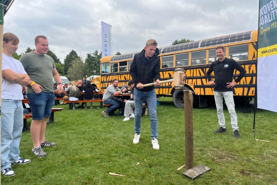Bij Atlas en Kooijmans is een spannende wedstrijd paal slaan aan de gang. In drie slagen wordt gekeken wie de paal het diepst in de grond krijgt. De winnaar lijkt richting de 11 centimeter diep te gaan met slechts drie slagen!
