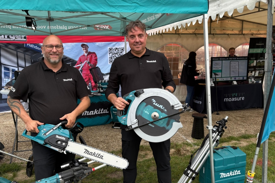 Bij Makita op de stand onder andere de grootste accucirkelzaag ter wereld. Ook kettingzagen mogen natuurlijk niet ontbreken. Ruud Steenbakkers en Raymond van Beest van Makita tonen trots hun waar.