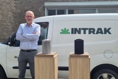 Intrak, Jeroen van de Ven (rechts) en Frank Hautvast: 'Het is een leuke en knusse Nationale Hoveniersdag. Lekker druk ook en mooi compact van opzet.' Over het roetfilter dat Intrak bij zich heeft, zegt Jeroen: 'Het is elektrificeren, filtreren of inhaleren.'