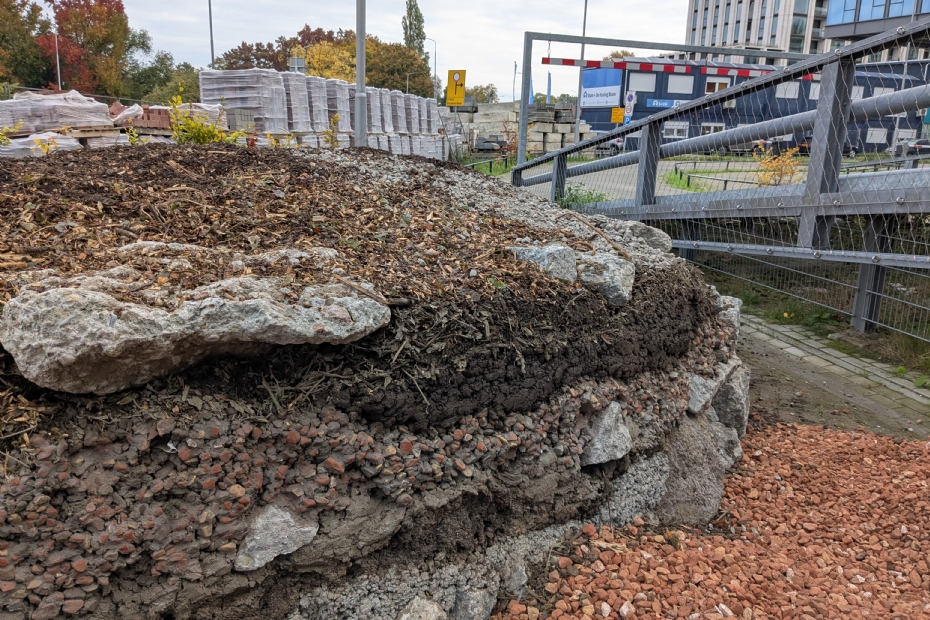 'We werken met verschillende afvalsoorten. Je ziet hier stukken fundering waar de staaldraad nog in zit. Dat materiaal wordt vaak als afval gezien, maar wij willen het hergebruiken. Afhankelijk van de samenstelling plaatsen we daarbovenop compost, houtmuls of teelaarde. Zo maken we het geschikt voor beplanting,' legt Deeben uit. Soontiëns vult aan: 'We willen een denkproces op gang brengen. Hoe kunnen we de stad vergroenen en restproducten hergebruiken? Als je oude betontegels kunt inzetten als basis voor groen, ben je al een eind op weg met verduurzaming.'