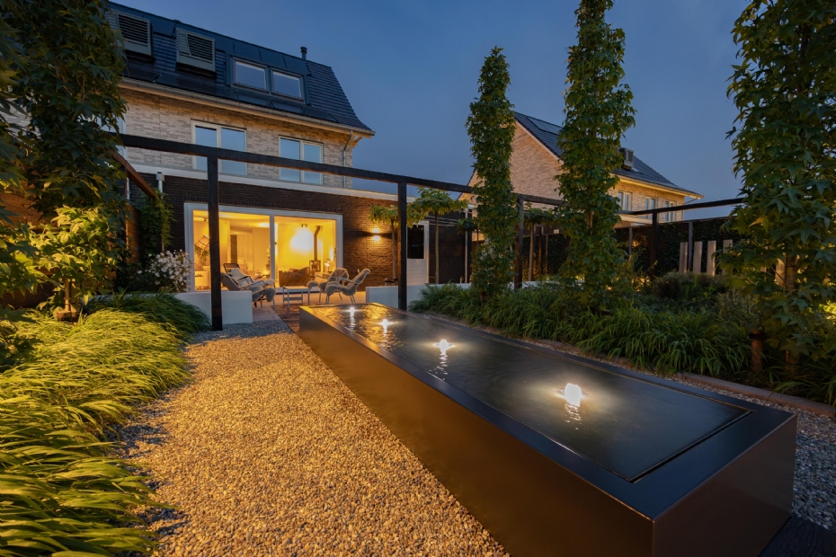 Onlangs plaatste Mocking Hoveniers een lange watertafel in een modern ogende tuin van een particulier in Meteren. 'De watertafel is een blikvanger en ligt precies op de zichtlijn vanuit de openslaande deuren van het woonhuis.' De tuin kenmerkt zich door een strakke lijnvoering en sfeervolle verlichting.