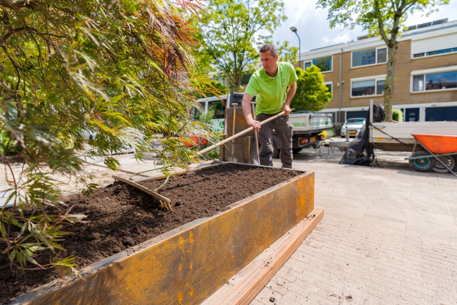 'Bij onze klanten is het altijd maatwerk. De ene klant vindt cortenstalen plantenbakken prachtig en een industriële sfeer uitstralen. Anderen noemen het roestige bakken en hebben er geen interesse in. Met cortenstaal kun je ook allerlei verhogingen maken en niveauverschillen accentueren. Cortenstalen plantenbakken halen we vaak bij Adezz vandaan. We kennen het bedrijf al jaren, zeker al een jaar of tien. Het begon met de bestelling van één cortenstalen plantenbak. Nu zijn het plantenbakken van allerlei materialen: van polyester tot metaal tot cortenstaal. Soms staan er zitbanken tegenaan.'