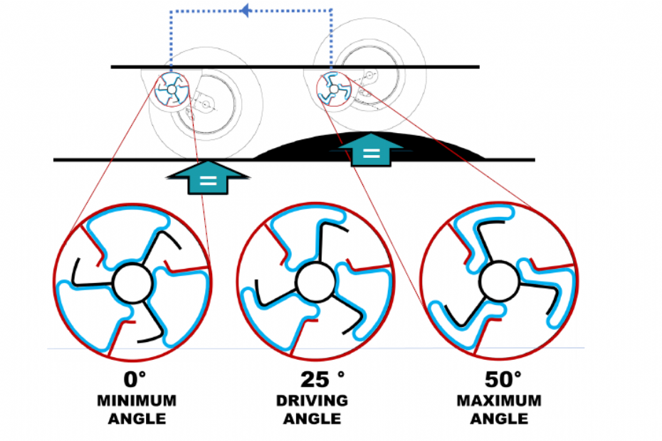 De ondernemer bedacht iets om aanhangwagens naar een hoger niveau te tillen. Het zogenoemde ThoraX-systeem biedt dezelfde voordelen als conventionele luchtvering, maar is compacter en praktischer van vorm. En het gaat nog verder; het veringsysteem is namelijk uitstekend geschikt voor kleinere aanhangwagens. De kracht blijft over een grotere hoek van de torsiearm (max. 50°) gelijk, wat bij een conventioneel systeem niet het geval is. Onderstaande afbeelding maakt inzichtelijk hoe dat functioneert. Naast andere voordelen zorgt dit ervoor dat de aanhangwagen nog vaster op de weg komt te liggen.