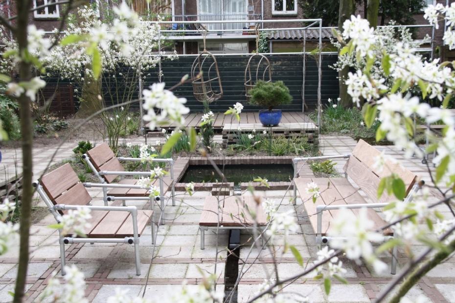 Het consequent toepassen van één materiaal zorgt voor rust en samenhang, mits goed doordacht. De tuin aan de Amsteldijk bood Hessels een blanco canvas. 'Ik had de kans om helemaal opnieuw te beginnen en besloot alle structuren, meubels en afscheidingen van steigerbuizen en vlonderplanken te maken. Zo ontstond een samenhangend geheel.'