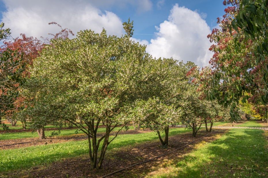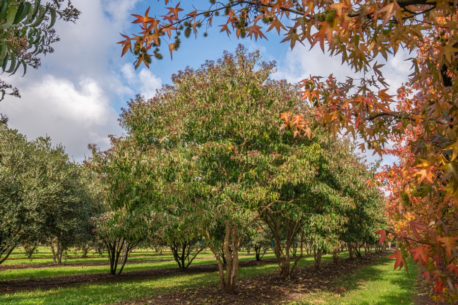 Vogelaar ziet daarin bepaalde trends: 'Een soort als Lagerstroemia 'Natchez' wordt populair; die is winterhard en heeft een prachtige bast, rijke bloei en een opvallende herfstkleur. Ook Heptacodium miconioides doet het goed: niet te groot, langbloeiend en aantrekkelijk voor bijen. Wat mij betreft, verdient Acer rubrum 'Sommerset' meer aandacht vanwege zijn rode voorjaarsbloei en spectaculaire herfstkleur.' Daarnaast ziet Vogelaar nog altijd veel belangstelling voor bomen met een transparante kroon. 'Gleditsia triacanthos 'Sunburst' is daar een goed voorbeeld van. Wij snoeien onze bomen bewust zo dat ze een open kroon ontwikkelen, met ruimte tussen de takken. Dat geeft licht en beleving.'