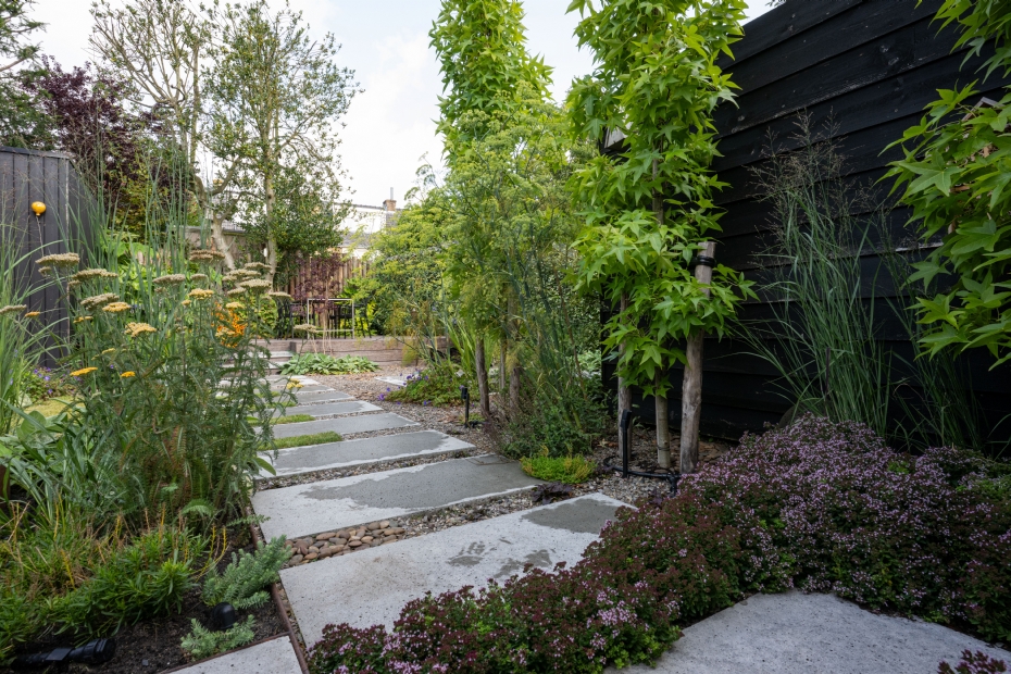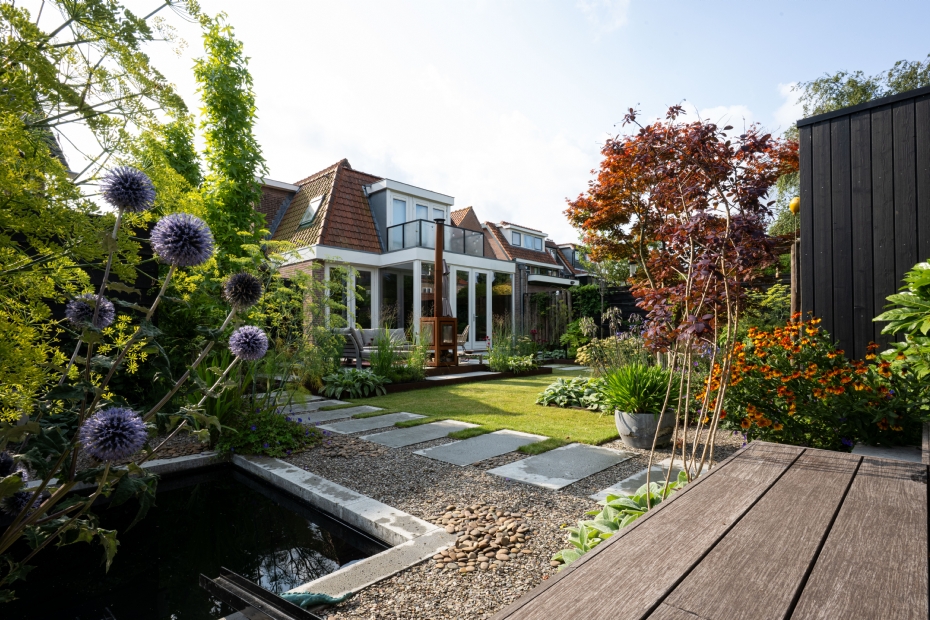 Een van de projecten waarin hun samenwerking tot bloei komt, is een tuin in Haarlem. De bewoners konden hun perceel uitbreiden en wilden de bestaande tuin meer samenhang geven. 'Ze hadden allebei een eigen wens', vertelt Van der Hulst. 'Hij wilde een stoere tuin met rechte lijnen; zij hield van lossere beplanting, bloemen en kleur. Mijn uitdaging was om die twee werelden te verbinden.'