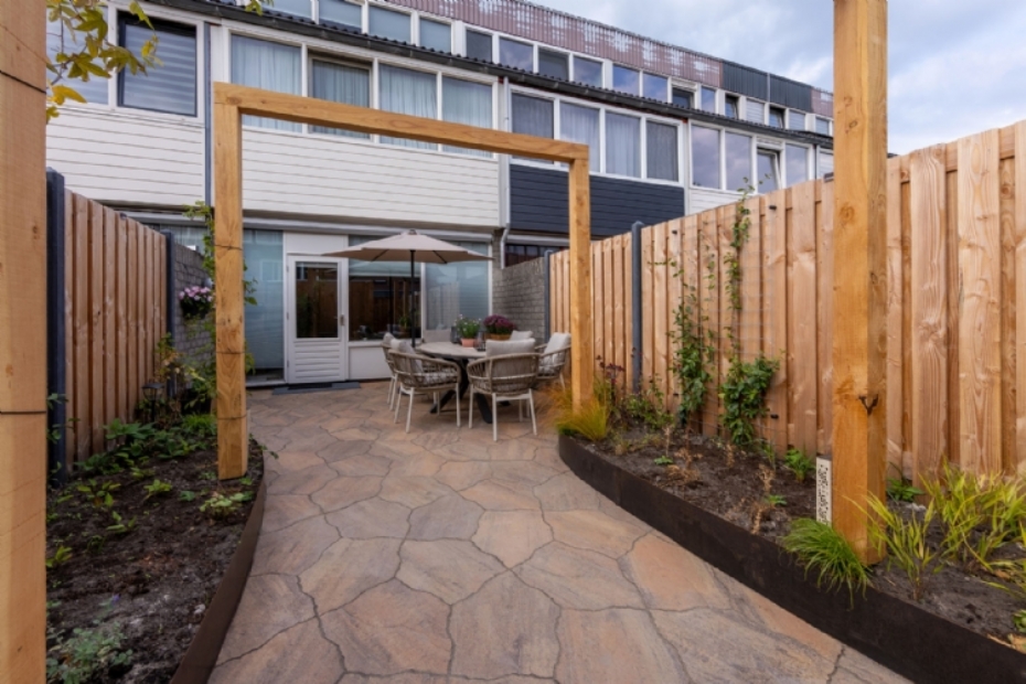 Bestrating als blikvanger In dit ontwerp speelt de bestrating duidelijk de hoofdrol. De warme tinten en de speelse vormen trekken de aandacht, maar blijven tegelijkertijd in balans met de rest van de tuin. Dankzij het gebruik van natuurlijke materialen en neutrale kleuren in borders en tuinmeubels, komt de GeoArdesia Alivo optimaal tot zijn recht. Zo ontstaat er een tijdloze, romantische buitenruimte die uitnodigt om elk seizoen opnieuw van te genieten.