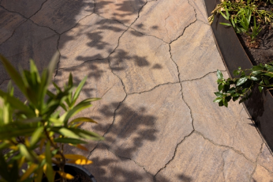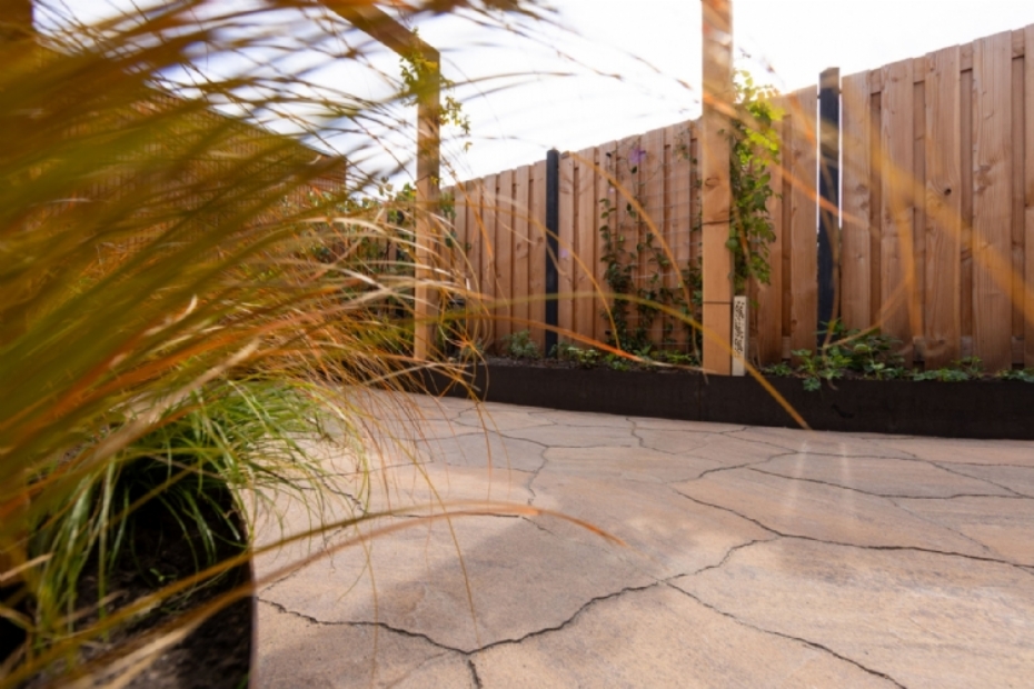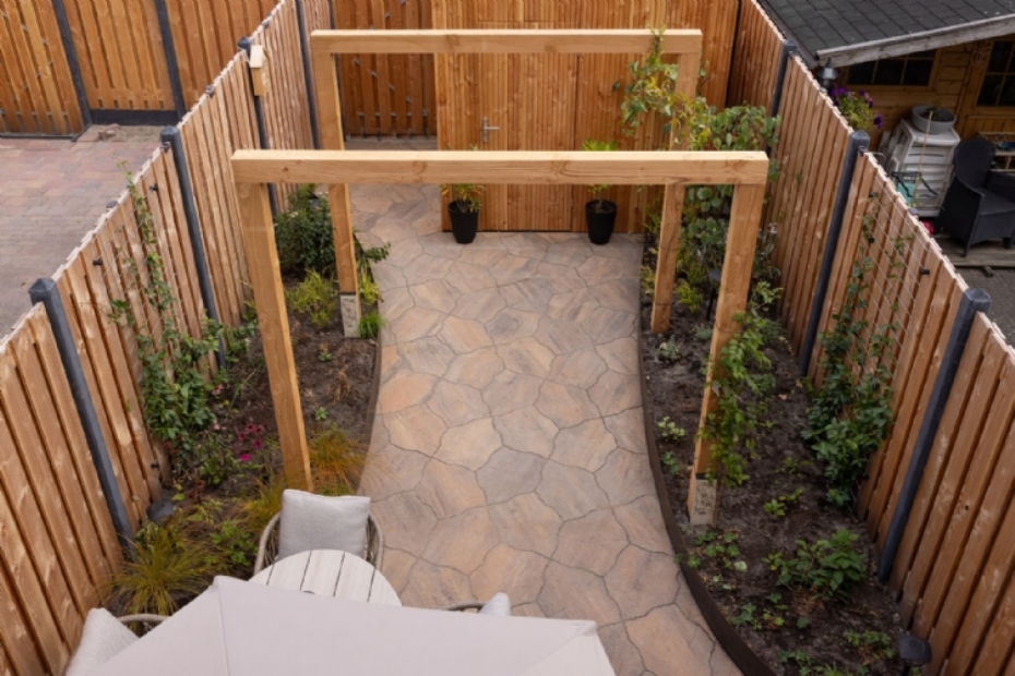 Organische elegantie in een compacte tuin Hoewel de tuin qua oppervlakte bescheiden is, voelt hij toch ruimtelijk aan dankzij de slimme toepassing van de GeoArdesia Alivo van MBI De Steenmeesters. Deze opvallende siertegel, met zijn vijfhoekige vorm en zachte, organisch gevormde randen, vormt een subtiele en vloeiende overgang van groen naar bestrating. Het resultaat is een natuurlijke en elegante verbinding die het gevoel van de tuin versterkt. Ondanks het unieke voorkomen is de tegel verassend eenvoudig te leggen.