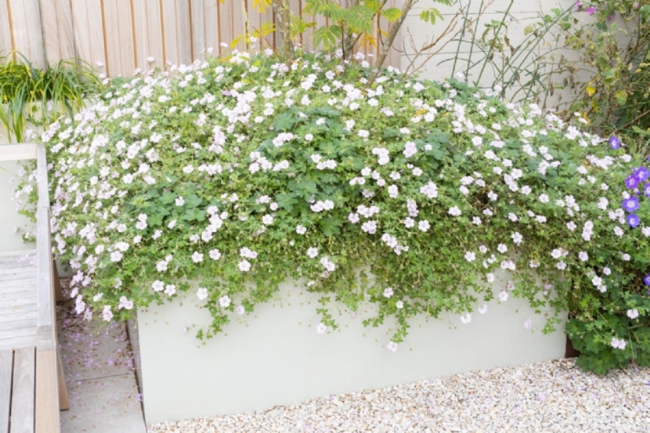 De keuze voor de kleur van de plantenbakken was RAL 7032. Het gaat hier om kiezelgrijs wat een ingetogen kleur is die in het zonlicht een zachte, bijna groengrijze tint krijgt. Deze kleur sluit mooi aan op de rest van de materialen in de tuin, zoals het witte grind, de zandkleurige tegels en de lichte schutting.