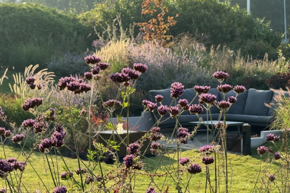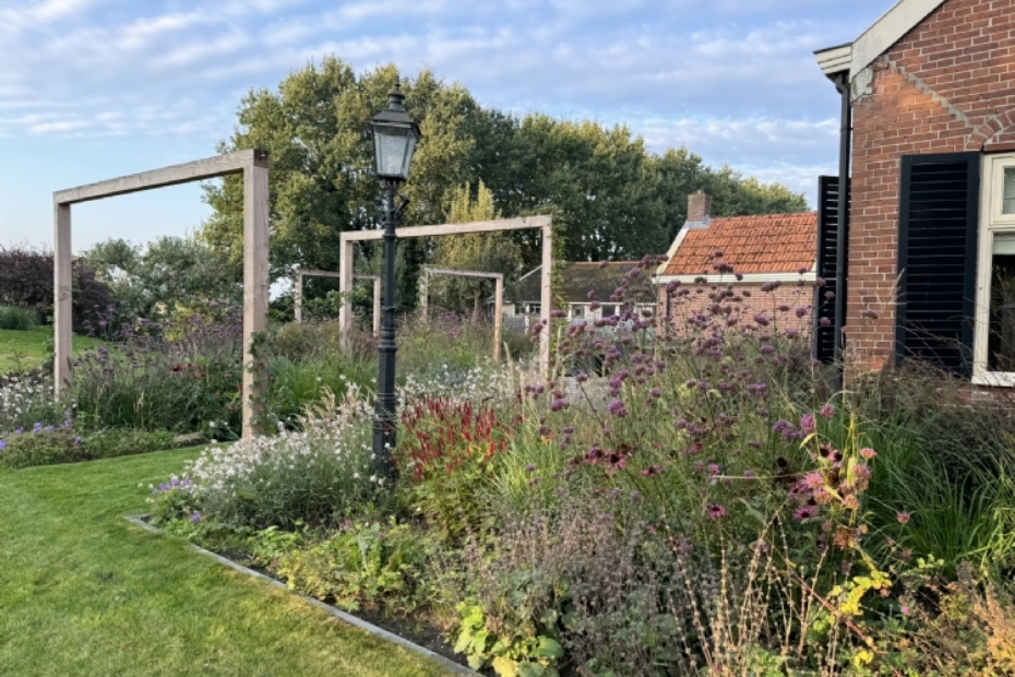 De basis van de tuin bestaat uit sterke vaste planten die de vakken snel vullen. Zodra de beplanting gesloten is, blijft het onderhoud beperkt. Dat sluit aan bij een veelgehoorde wens bij tuinontwerpers: een onderhoudsvriendelijke tuin. Die vraag komt niet alleen van drukke gezinnen, maar ook van oudere klanten met een grote tuin. Nu mensen steeds langer zelfstandig blijven wonen, groeit de behoefte aan een tuin die weinig inspanning vraagt.