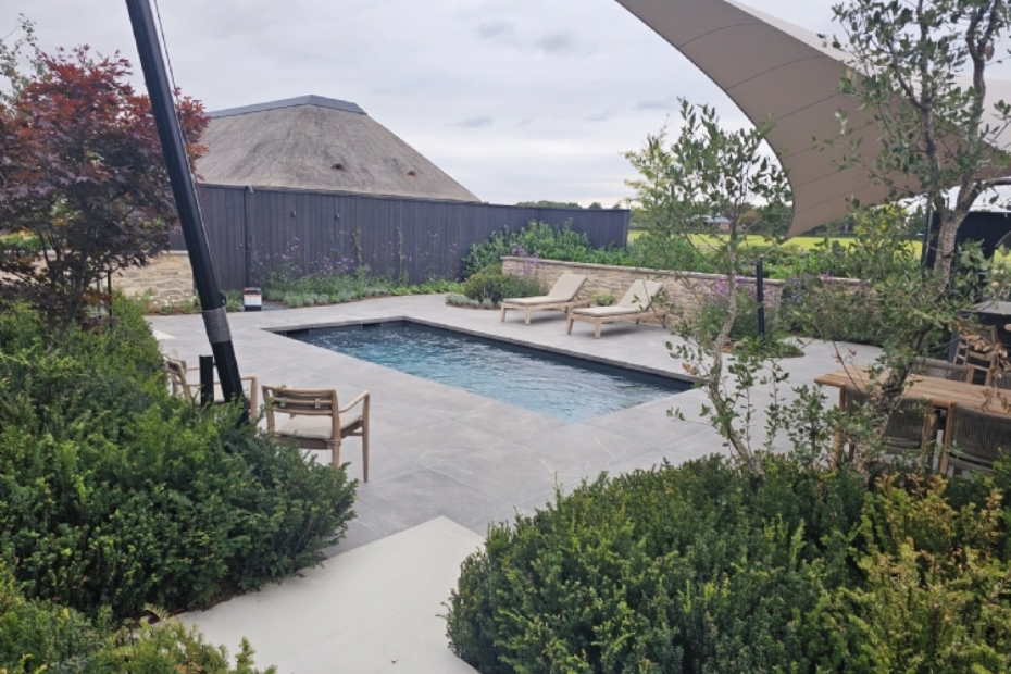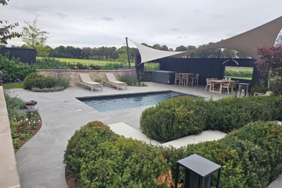 | Een exclusief buitenproject waar luxe, rust en natuur samenkomen: zwembad en jacuzzi in perfecte harmonie met de tuinarchitectuur. |