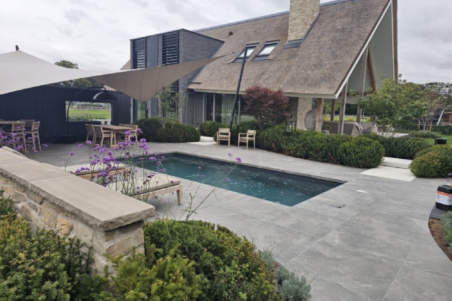 Het zwembad is compact van formaat, maar hoogwaardig uitgevoerd. Grote natuurstenen tegels bepalen het beeld en zorgen voor een rustige en samenhangende uitstraling. Door de strakke lijnen en beperkte detaillering oogt het zwembad modern, terwijl het materiaalgebruik zorgt voor een warme uitstraling. De jacuzzi is in het ontwerp geïntegreerd en vormt samen met het zwembad één geheel. Daardoor is het wellnessgedeelte het hele jaar door bruikbaar.